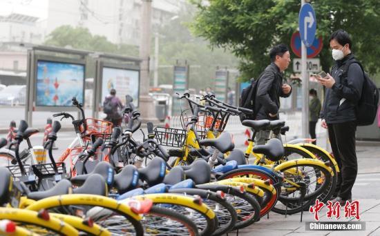 5月5日,北京遭遇大风扬沙天气,气象台发布大风黄色预警,阵风达8、9级,局地伴有扬沙。图为街头被大风吹倒的一排共享单车。中新社记者 廖文静 摄