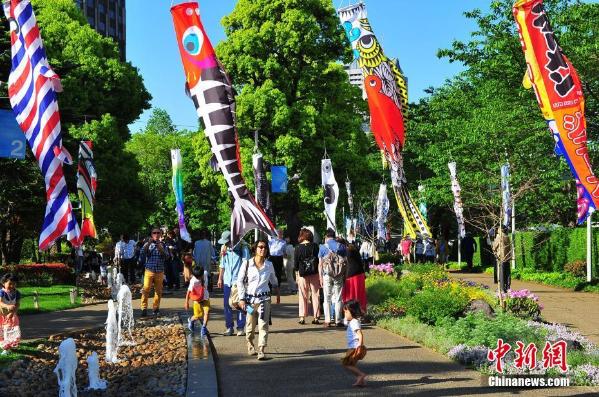 5月5日在日本被定为“儿童日”,也是其传统的男孩节。各处纷纷挂起传统节日饰品“鲤鱼旗”(鲤鱼形状的特色幡子)。图为当天东京市中心一角“鲤鱼旗”飘飘的情景。 中新社记者 王健 摄