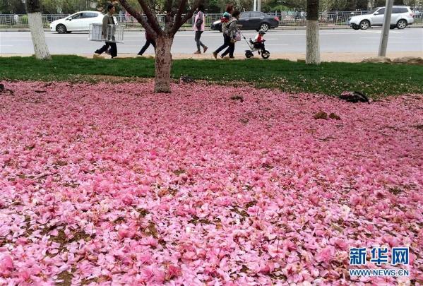 一辆有轨电车从大连街头一处落满樱花的绿化带旁驶过,在降雨和大风的作用下,不少樱花凋谢落地,宛如鲜花铺成的地毯。