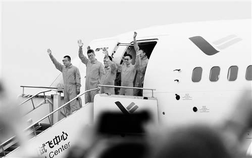 5月5日,执行首飞任务的机组成员在C919客机安全着陆后走出舱门,向观众挥手致意。 新华社发