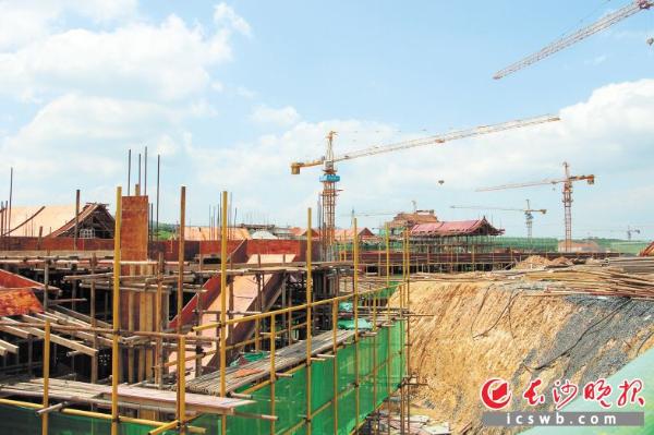 5月4日,美丽中国·长沙文化产业示范园工地,工人们趁着天气晴好抓紧施工,大型卡车在工地里穿梭,与机器轰鸣声合奏出一曲动人乐曲。“去年5月正式开的工,那时候还是一片荒地,现在‘雷峰塔’都快建好了。”凌访指着远处高耸的一座宝塔建筑说。