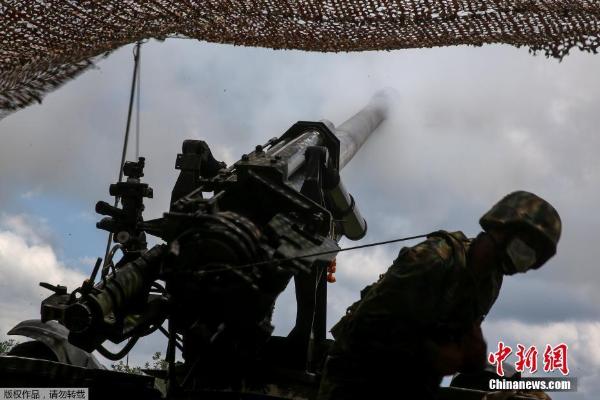 当地时间5月8日,泰国海军陆战队在尖竹汶省举行年度实弹射击演习。图为泰国海军陆战队的155毫米榴弹炮开炮。