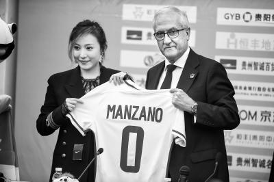 昨天,中超球队贵州恒丰智诚队新任主教练曼萨诺首次来到贵州队主场贵阳奥体中心,与球队进行第一次合练。图为贵州恒丰智诚队董事长文筱婷(左)向曼萨诺赠送零号球衣。新华社发