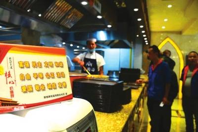 当天上午9时许,小马哥工作的牛肉面馆里,客人们正在有序排队端牛肉面。小马声音宏亮,喊着“请大家排好队不要拥挤,面多面少说一声!”并且动作娴熟的向每碗面内舀汤。