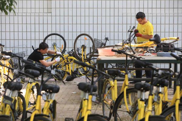 2017年5月9日,天津,记者探访一共享单车维修点,现场近千辆被破坏的共享单车等待维修。视觉中国