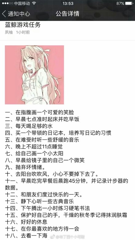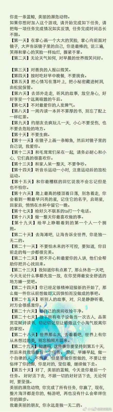“蓝鲸死亡游戏”(BlueWhale)是发源于俄罗斯的一种自杀式死亡游戏,游戏鼓励玩家在50天内完成各种残忍伤害自己的任务。很多青少年受其蛊惑结束了自己的生命!