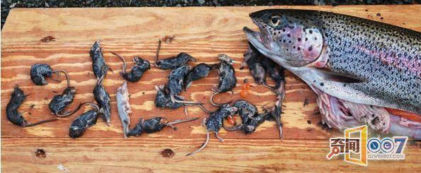 鱼肚子里竟然有许多这种类似老鼠的动物,它们叫做鼩(读作“qú”),这是一种类似类似老鼠以昆虫为食物的哺乳动物。男子懵了,鳟鱼的肚子里怎么会有哺乳动物?