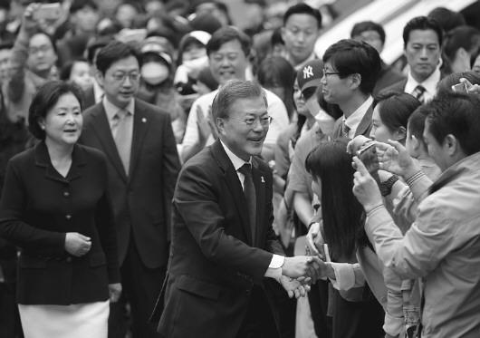 5月9日,在韩国首尔,文在寅(前中)与支持者握手。 (□新华社发)