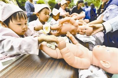 5月7日,安徽省合肥市蜀山区井岗镇兴民社区计生协会组织辖区内留守儿童、农民工子女体验育婴室护士职业,让小朋友们感受给小宝宝脱衣服、洗澡、换尿布等护理过程。