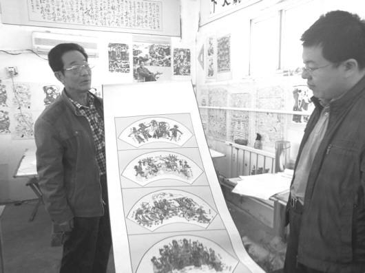□王兆锋 报道 东昌府木版年画区级传承人郭春奎在展示其创作的作品。