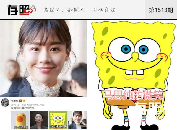 【“马思纯的微笑”获当事人盖戳认证】周冬雨跟马思纯一起获得了金马奖影后,这两个闺蜜不仅是工作上的默契拍档,私下也是能大方自黑的好友。跟周冬雨差不多时间,马思纯也晒出了一组自己撞脸海绵宝宝、周冬雨撞脸小黄鸭的照片,这官方认证也是没谁了!