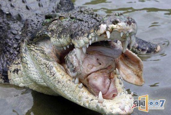 在马尼拉的一座鳄鱼公园内刚好抓拍到这条咸水鳄的进食瞬间。这只饥饿的爬行动物尽情享用了重达6.5公斤的猪头。这顿肉餐对一条咸水鳄来说几乎算不上一顿美食。这种鳄鱼可吃掉它们用嘴巴夹住的任何猎物。这些凶猛捕食者还以吃掉从水牛、野猪甚至鲨鱼等许多种猎物著称。