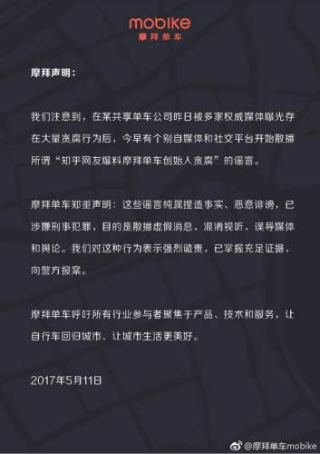 摩拜回应贪腐传闻。昨日有媒体和社交平台发布“知乎网友爆料摩拜单车创始人贪腐”的消息,摩拜单车官方微博发声明驳斥,称纯属捏造事实、恶意诽谤;已向警方报案。摩拜单车称,这些谣言纯属捏造事实、恶意诽谤,已涉嫌刑事犯罪,目的是散播虚假消息,混肴视听,误导媒体和舆论。