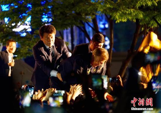 当地时间5月9日深夜,文在寅及其竞选团队现身首尔光化门广场,发表“胜选演说”,与支持民众握手庆祝。中新社记者 吴旭 摄