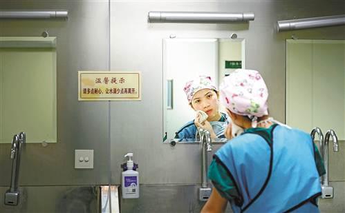 5月11日17:05 在医院手术室洗手处,第二台手术结束,身穿近30斤重防护服的周丽璇用冷水洗脸以振奋精神。