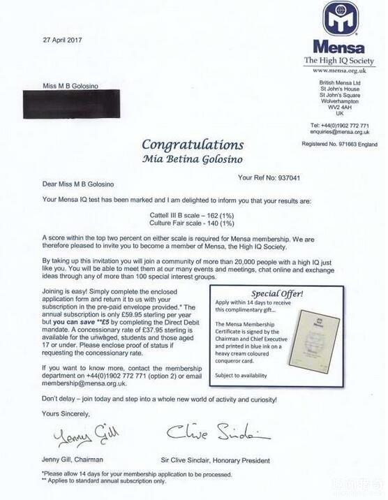 ▼事实上,IQ分数只要超过140分,就是世界上屈指可数的天才。米亚的分数不只高过于爱因斯坦,也超过了史蒂芬霍金、比尔盖兹等当代代表人物,让英国高智协会(British Mensa)向米亚提出邀请加入。