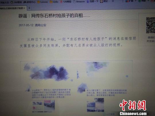 中新网保定5月12日电 (吕子豪 于俊亮)从11日下午开始,一则“东石桥村有人抢孩子”的消息在河北保定的微信朋友圈迅速传播,消息中还配有几名男女被众人殴打的视频。12日,事发地保定市清苑区公安局在官方微信公开辟谣:系当地村民与兜售冷饮的员工发生肢体冲突的“打架案件”。