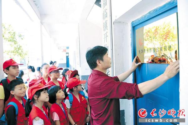 在校园记者的注视下,长沙县开物小学校长袁勇卫将爱心书屋牌匾挂了起来。 长沙晚报记者 小刘军 摄