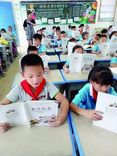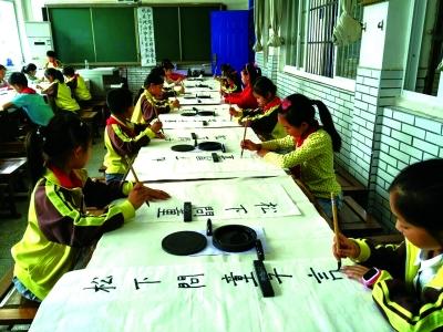为了使孩子人格得到熏陶,文化品位得到提升,学校编写了《书法》、《经典诵读》两套校本课程。每周安排专职教师上课一节;成立“杨鼎华书法工作室”和“黄金娥诵典工作室”,加强书法和经典教研活动,定期邀请著名的专家、书法家来校讲座,指导教师、学生习字诵典;开展“一日一练 一日一诵”活动,学校每天早上安排20分钟诵读,中午安排20分钟书法,晨读午练时,安排专职教师到班,书法工作室教师分配到各年级进行书法指导,同时成立学生书法活动室,对有潜质的学生进行提高训练,由专职书法教师辅导。