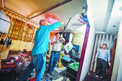 昨天上午,在朝阳区九龙花园,工人对一处群租房内的隔断进行拆除。