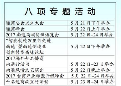 本届江海博览会暨首届通商大会主会期为5月21-24日。除开幕式外,本届博览会还将举办8项专题活动,包括通商总会成立大会、通商峰会、2017南通高端纺织博览会、“智能制造万里行走进南通”暨南通制造业创新转型高峰论坛、2017海外知名侨商南通行活动、南通风情文艺演出、2017台商产业转型升级峰会、千名通商故里行活动等。