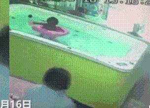 画面中,一名看起来才两三岁大的孩子在小小的泳池里面玩耍,身上套了一个粉色的游泳圈,周围无大人看管。突然,小孩做了一个前倾的动作,随后便头朝下整个人栽到了水池里。