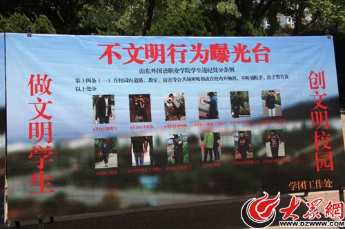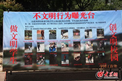 18日,大众网记者来到山东外国语职业学院看到,被摆在校园里的不文明行为曝光台共有两个展板。其中一个展板发布了12张照片,集中曝光了部分学生在校园内随意吸烟的不文明行为。另外一个展板发布21张照片,主要曝光了校内饲养宠物、随意吸烟以及情侣间亲密行为等。其中,涉及大学生情侣拥吻或牵手的照片有7张。大众网记者注意到,被公开的情侣亲密照多是侧面,并且所有曝光照片均已打码。