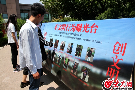 山东外国语职业学院学生在曝光台前观看各类不文明行为照片。