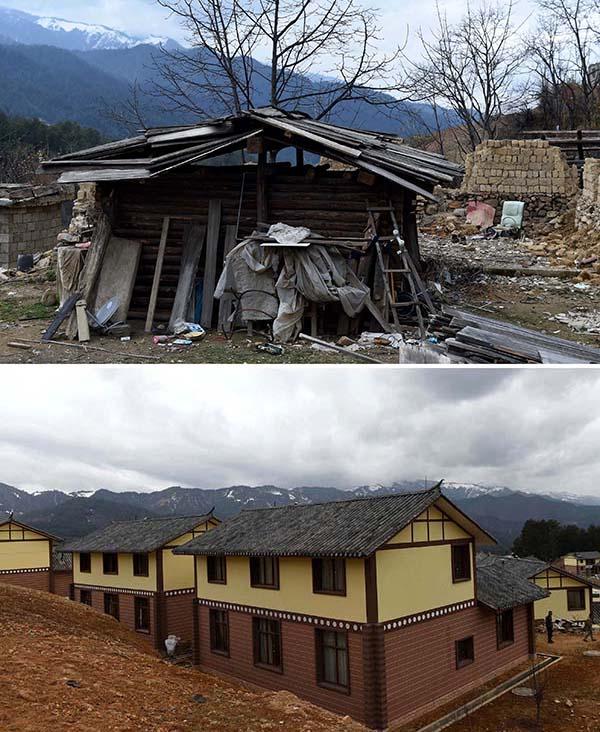 上图:云南省维西傈僳族自治县永春乡庆福村傈僳族群众的旧居;下图:易地扶贫搬迁的新居(3月29日摄,拼版照片)。