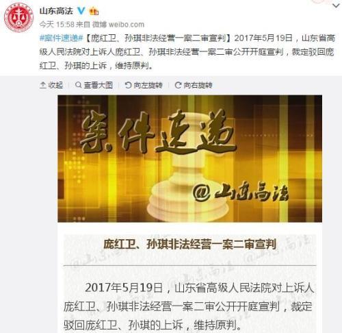 中新网5月19日电 山东省高级人民法院官方微博19日消息,5月19日,山东省高级人民法院对上诉人庞红卫、孙琪非法经营一案二审公开开庭宣判,裁定驳回庞红卫、孙琪的上诉,维持原判。