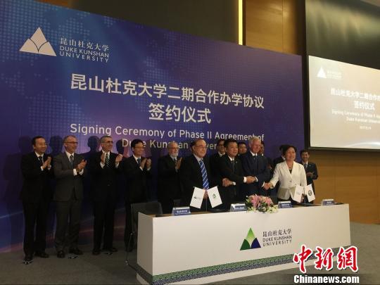 中新网昆山5月19日电 (黄莹)19日,江苏昆山市人民政府、美国杜克大学、武汉大学、昆山杜克大学共同签署了昆山杜克大学二期合作办学协议,宣布正式启动学士学位教育。这也是美国前十顶级名校中,唯一一所在中国开设学士学位教育、授予学士学位的大学。