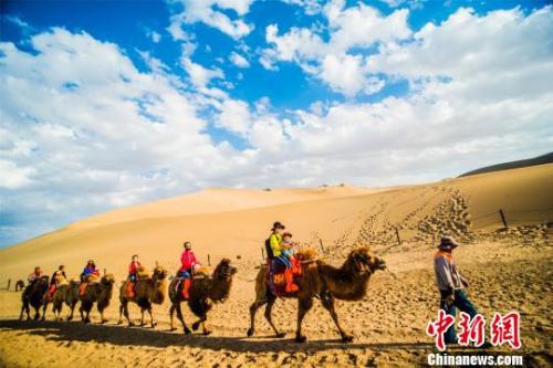 资料图:游客骑骆驼在鸣沙山景区观光游览。 王斌银 摄