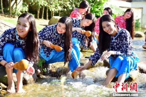 资料图:姑娘在湖边洗发。 曾令华 摄