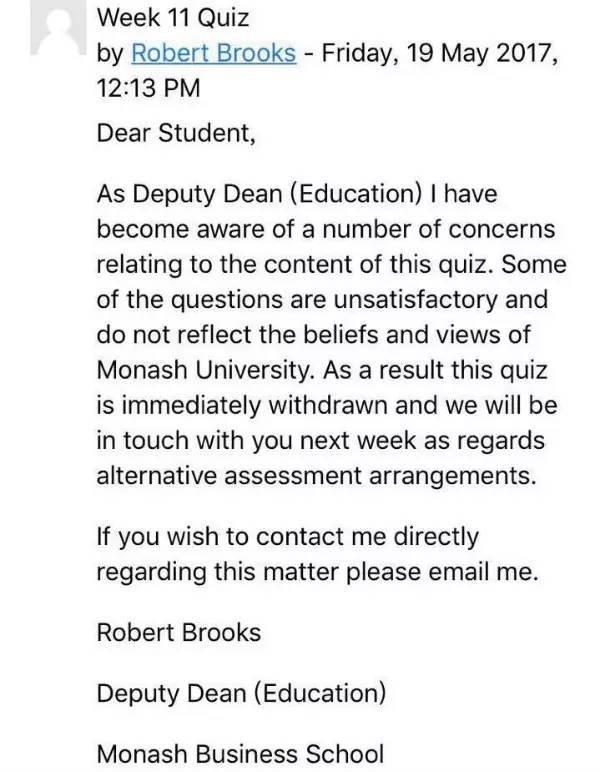 在当地留学生的努力下,最新的情况是,莫纳什大学校方19日就此事做出回应。莫纳什大学商学院教育副院长Rorbert Brooks在给学生的邮件中说,试题中的一些问题令人不满,也不代表莫纳什大学的观点。他们将立即撤回这个测试。
