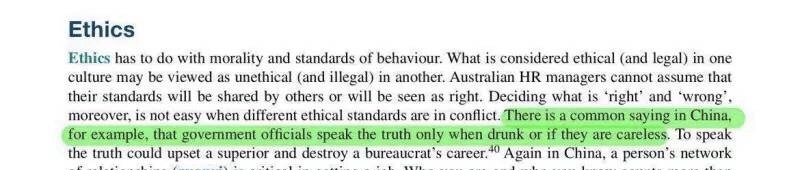 高崧19日告诉环环,他们在朋友的帮助下找到,教材中表述的参考材料来自香港《南华早报》2003年的文章。文中讲述了深圳对于1432名国家干部的调查,发现他们大多数时候都不能告诉同事和群众真相。因为他们害怕说出真话会冒犯更高级别的领导干部,断送自己的政治生涯。高崧认为,现在中国的发展,尤其是最近5年可以说是日新月异。学校用2003年的观点教导学生去看现今的中国,显然不客观、不准确。况且就连莫纳什大学都有规定,参考文献必须用最近5至10年的,再远的就没有参考价值了。