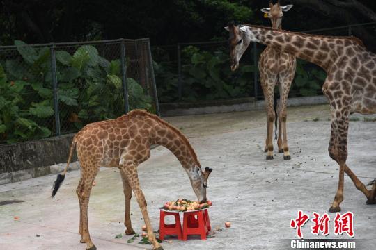 动物园工作人员和游客一起为小长颈鹿准备了别具一格的水果“蛋糕” 李木生 摄
