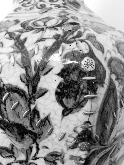 作为大学老师,关向伟有很多机会去外地考察,在了解了多个外地博物馆、老旧民居、古玩市场后,他认为在锔瓷工艺上不能拘泥于传统和地方,应该有所探索,技艺上也应有所创新。浮雕效果的锔瓷,是关向伟的一大创新。他首先对瓷器进行构思、设计,然后寻找铜料,铜料选用民国时期的老铜,要将老铜器熔炼,打成片和棒,再使用焊枪将铜焊到瓷器上,铜在瓷器上呈现浮雕效果,有花朵形状、鸟类形状等。