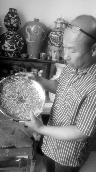 “这是折枝,就是折一个树枝,把树枝画到陶瓷上。这是缠枝,是一个缠绕的树枝,在陶瓷上看不到起始点在哪里。”关向伟一边拿出两个陶瓷艺术品,一边绘声绘色地向记者讲解什么是陶瓷。这件“折枝陶瓷”受伤了,变成了残瓷,但它在关向伟心中却依然有艺术价值。