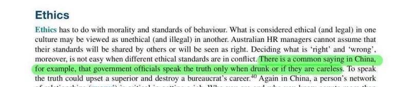 高崧19日告诉环环,他们在朋友的帮助下找到,教材中表述的参考材料来自香港《南华早报》2003年的文章。文中讲述了深圳对于1432名国家干部的调查,发现他们大多数时候都不能告诉同事和群众真相。因为他们害怕说出真话会冒犯更高级别的领导干部,断送自己的政治生涯。高崧认为,现在中国的发展,尤其是最近5年可以说是日新月异。学校用2003年的观点教导学生去看现今的中国,显然不客观、不准确。况且就连莫纳什大学都有规定,参考文献必须用最近5至10年的,再远的就没有参考价值了。
