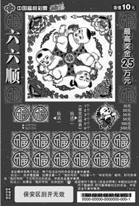 中国福利彩票“刮刮乐”一直以来深受广大彩民的青睐,它以即开即兑的特点,超高返奖率的优势,不断的给彩民带来惊喜与实惠。新票“六六顺”面值10元,最高奖金25万元。共有两个玩法,两个玩法区内的中奖奖金兼中兼得。