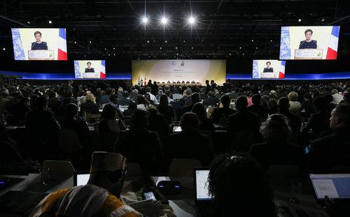 资料图片:2015年11月30日在法国巴黎北部市郊的布尔歇展览中心拍摄的气候变化大会开幕式现场。新华社记者 周磊 摄