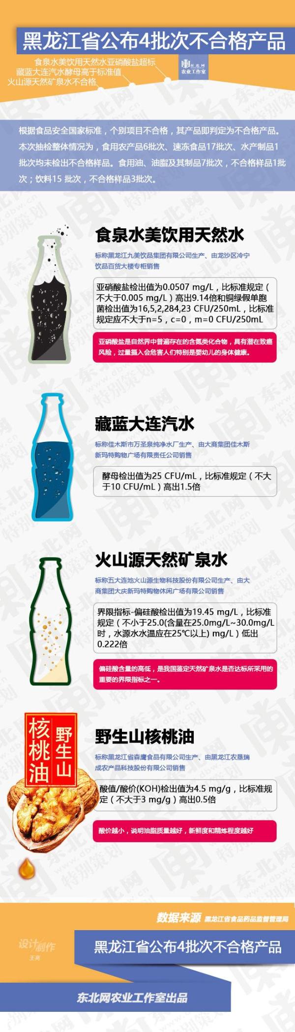 其中,不合格产品分别为,标称佳木斯市万圣泉纯净水厂生产、由大商集团佳木斯新玛特购物广场有限责任公司销售的藏蓝大连汽水,酵母检出值为25 CFU/mL,比标准规定(不大于10 CFU/mL)高出1.5倍;标称黑龙江九美饮品集团有限公司生产、由龙沙区冷宁饮品百货大楼专柜销售的食泉水美饮用天然水,亚硝酸盐检出值为0.0507 mg/L,比标准规定(不大于0.005 mg/L)高出9.14倍;标称五大连池火山源生物科技股份有限公司生产、由大商集团大庆新玛特购物休闲广场有限公司销售的火山源天然矿泉水,界限指标-偏硅酸检出值为19.45 mg/L,比标准规定(不小于25.0mg/L)低出0.222倍;标称黑龙江省森鹰食品有限公司生产、由黑龙江农垦瑞成农产品科技股份有限公司销售的野生山核桃油,酸值/酸价(KOH)检出值为4.5 mg/g,比标准规定(不大于3 mg/g)高出0.5倍。