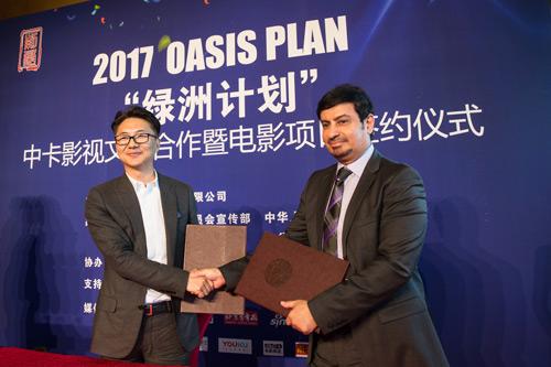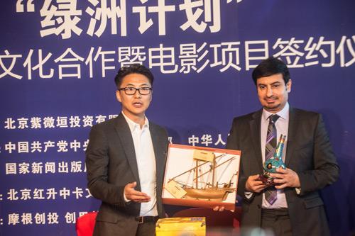 5月22日,北京紫微垣投资有限公司与卡塔尔王室投资代表在北京签署影视文化战略合作协议,双方宣布正式启动“绿洲计划”影视文化合作并共同设立总值近17亿元人民币的影视基金,携手搭建以影视合作为核心的“一带一路”文化传播合作平台 。当天,卡塔尔国酋长艾哈迈德﹒穆罕默德.J.M.阿勒-萨尼阁下及卡塔尔国驻华大使苏尔坦.曼苏里阁下与北京紫微垣投资有限公司代表一同出席,正式签约首部电影项目合作,并承诺将共同发起设立“中国影视合作基金”和“卡塔尔北美影视投资基金”两支投资基金。双方达成高度共识,一致认为“绿洲计划”将成为中卡影视协同发展的先驱桥梁,未来会制作出更加多元精彩的电影作品与世界各地的观众见面。签约仪式结束后,双方互赠礼物并合影留念。
