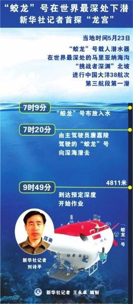 据新华社“向阳红09”船电“蛟龙”号载人潜水器23日在世界最深处的马里亚纳海沟“挑战者深渊”北坡进行中国大洋38航次第三航段第一潜。新华社记者刘诗平搭乘“蛟龙”号在马里亚纳海沟深潜,首探神秘“龙宫”,成功下潜至4811米,水中时间8小时50分,海底作业3小时11分。