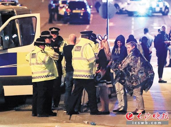 5月22日,警察在发生爆炸的体育馆外与民众交谈。