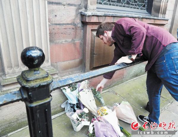 5月23日,曼彻斯特一家教堂外,人们放置鲜花,哀悼死难者。