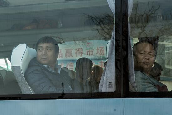 2月27日,高炉工李庆锋(左一)和同事在老厂区坐上大巴车,去300多公里外的兰陵新厂区上班。