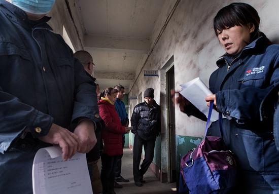 2016年12月29日,球墨厂动力车间的主任办公室门外,职工们排队领取搬迁分流安置方案。