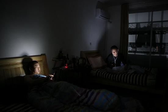 4月3日深夜,临沂市兰陵县新厂区职工宿舍的房间里,汽轮机工马培山(左)和电工杨德中用手机和家人聊天。