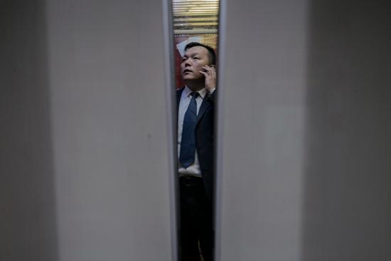 3月8日,39岁的李超穿着专为新工作买的西服在电梯里。曾是汽轮机工的他选择买断工龄,去一家保险公司上班。